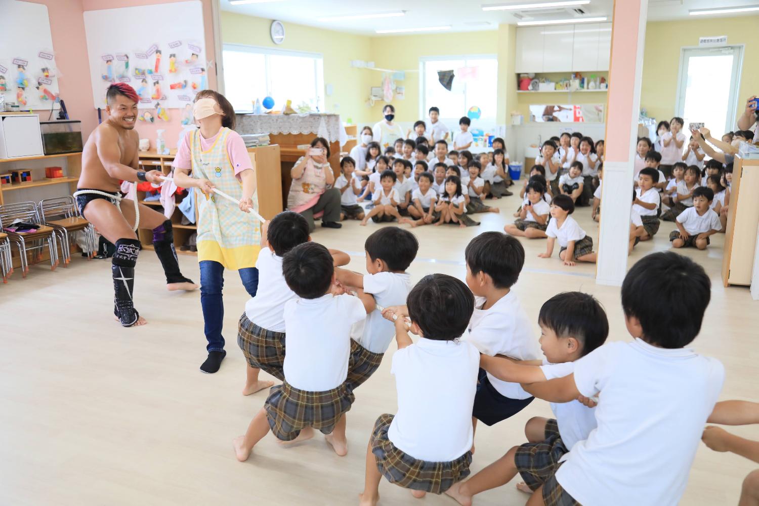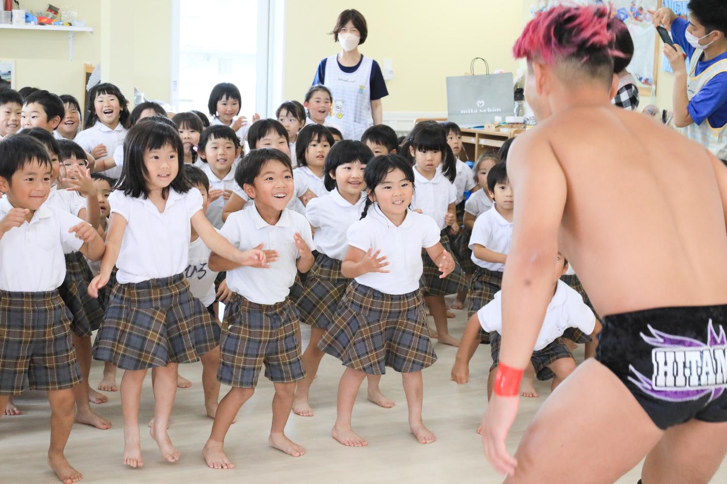 レスラーは子供達と体当たりでコミュニケーションを取りながら、精一杯伝えています!